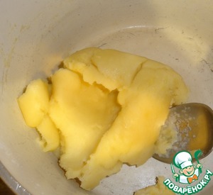 Воду со сливочным маслом вскипятить. Снять с огня и тут же всыпать в воду муку и энергично растереть. Снова поставить на огонь и, продолжая растирать, разогревать, пока масса не станет однородной и не соберётся в шар.