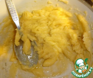 Снять с огня и немного остудить. Яйца взбить и, понемногу добавляя в тесто, продолжать взбивать, пока яйца не кончатся, а масса не станет гладкой и блестящей.