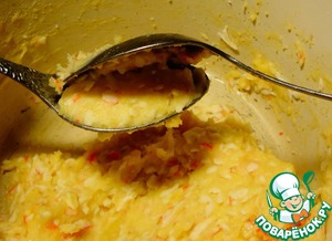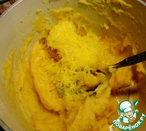 Положить в тесто натёртый на мелкой тёрке сыр. Перемешать.