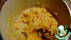 Вввести туда же натёртые крабовые палочки. Перемешать. Досолить по вкусу.