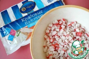 Я для пущей красоты нарезала крабовые палочки тоненькими полосочками и уложила в форму (как на фото).