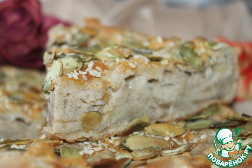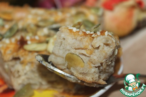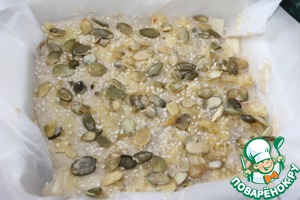 Форму застилаем бумагой, выливаем тесто, сверху натрём оставшуюся половинку яблока, распределяя по всей поверхности. Посыпаем кунжутом и тыквенными семечками.