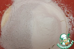 К желткам добавляем просеянную муку, хорошо перемешиваем.