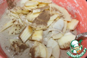 Чистим яблоки, срезаем кожуру и удаляем сердцевину. Оставляем половинку одного яблока целой. Остальное нарезаем на небольшие кусочки, добавляем в тесто, посыпаем корицей и хорошо перемешиваем.
