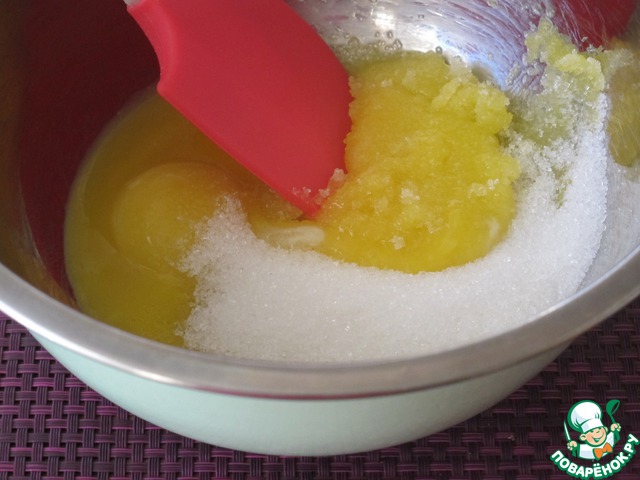 Муку в смеси с крахмалом и разрыхлителем просеять во взбитые желтки с белками. Все осторожно перемешать.