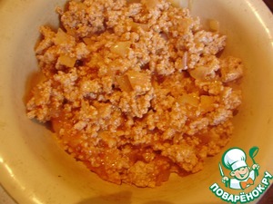 Обжарим фарш с луком на растительном масле пару минут. Затем добавим разведенную томатную пасту и потушим до испарения жидкости. Затем фарш отставим остывать.
