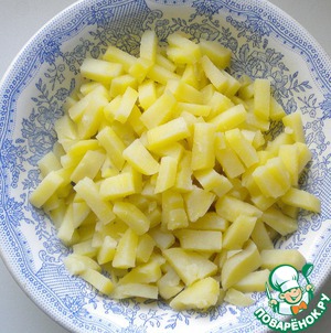 Картофель отвариваем в мундире, остужаем и нарезаем примерно такими брусочками.