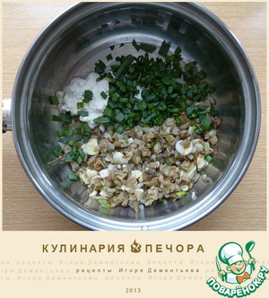 В кастрюлю с толстым дном выложить грибы, мелко рубленный зеленый лук, хрен,