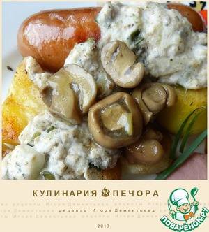 Можно соус украсить небольшими маринованными грибочками, например, сыроежками.