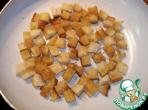 Сливочное масло растопить. У свежего батона срезать корочку, нарезать его кубиками, обжарить до золотистой корочки. По вкусу добавить специи. Я беру смесь для салатов.