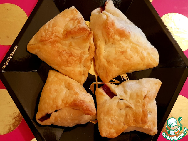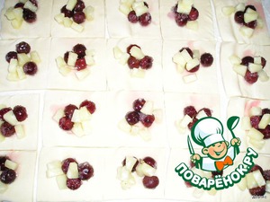 Разворачиваем размороженное тесто. Не раскатываем! Режем на квадратики. На каждый квадратик кладём по три вишенки с сахаром и немного ананасовых ломтиков.