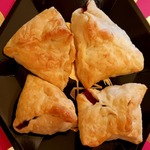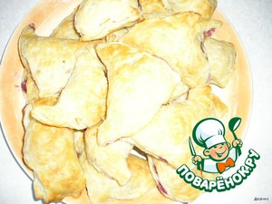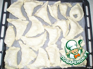 Слепляем края, формируя треугольники или прямоугольники. Выкладываем слоечки на противень, застеленный пергаментной бумагой. Вилкой слегка прокалываем каждую слоечку 4-5 раз по её верху. После каждую слегка смачиваем водой.