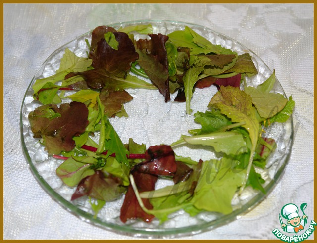 На тарелку выкладываем листья салата, у меня салатный микс (но также и без салата можно подавать, все равно будет вкусно).
