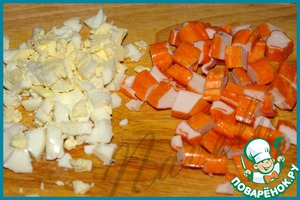 Вареное яйцо и крабовые палочки нарезать средними кубиками.