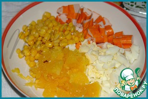 Смешиваем крабовые палочки, кукурузу, яйцо, апельсин.