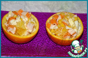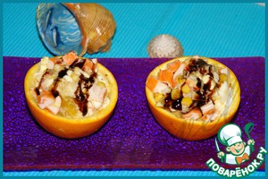 В чашечки от апельсина выкладываем наш салат, поливаем заправкой.