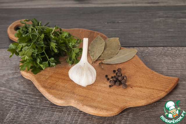 Берем петрушку, чеснок (очистить), лавровый лист, перец душистый и перец черный горошек.