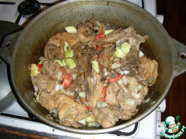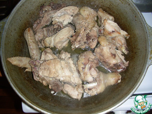 Смазываем казан или глубокую толстостенную сковороду растительным маслом, складываем куски курочки и начинаем готовить на сильном огне, чтобы мясо слегка "схватилось". Затем доливаем 0,5-1 стакан кипяченой воды и продолжаем готовить на самом маленьком огне 20-30 минут (до полуготовности).