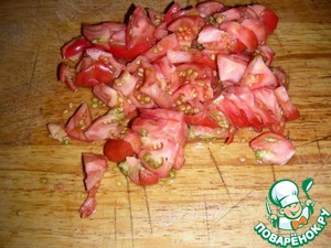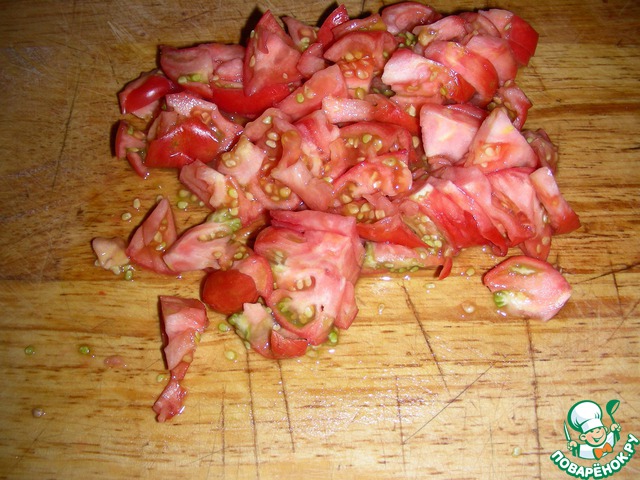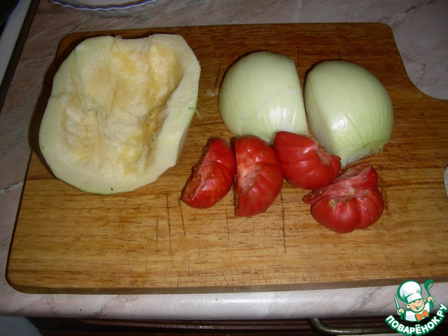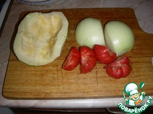 Пока курица тушится, подготавливаем цуккини, лук и помидор. У меня помидоры маленькие, поэтому беру 2 шт.
