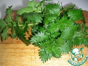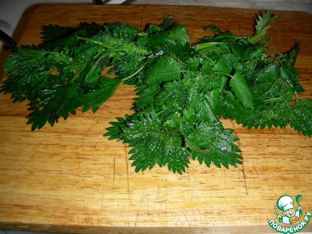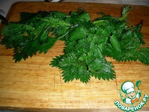 Обдаём крапиву кипятком, чтобы не кололась, удаляем грубые черешки и режем поперёк листьев.