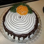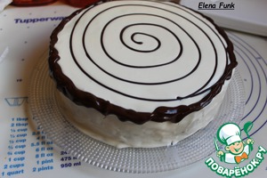 Ну, теперь украшаем. Я растопила шоколадку, нарисовала сначала полоски, сделала кантик. Кантик делала так: просто срез на мешочке сделала больше и прошлась по краю, мне хотелось именно такой вид.