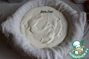 Сметану я заранее поставила вот таким образом, чтобы стекла лишняя жидкость. В чашку на дно насыпаем соль. (Соль вытягивает лишнюю воду). И ставим часа на 3 в холодильник, ну, это в том случае, если у вас жидкая сметана.
