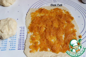 Тесто разделим на 6 частей. Раскатаем тонко, примерно 2-3 мм. Выкладываем нашу начинку. Скатаем в рулет.