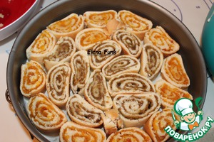 На дно выливаем 3 ложки сметанного крема. И выкладываем плотно наши рулетики. Вот таким образом (форма у меня 26 см) -
