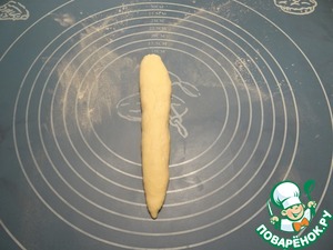 Беру один кусочек теста, формую из него жгут, один конец которого тоньше, чем другой. При формовке использую муку для подпыла, так как тесто чуть липнет к рукам.
