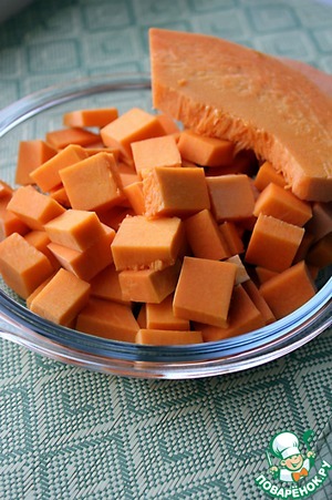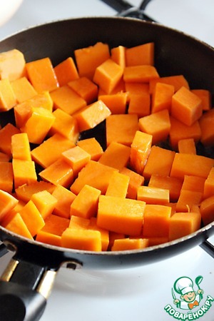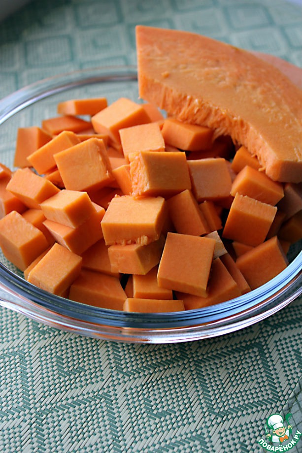 Необходимо очистить тыкву и нарезать средними кубиками, шириной примерно в 5 см
