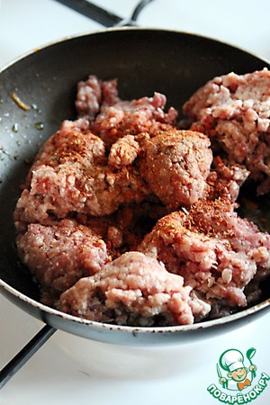 В том же масле обжарить фарш со специями (ямайский душистый перец, молотая зира, кайенский перец) до испарения жидкости, посолить по вкусу.