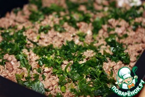 Зелень кинзы, фарш, кинза, соус.
