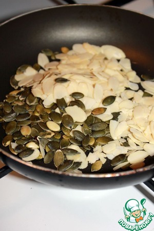 Обжарить на сухой сковороде миндальные лепестки и тыквенные семечки.