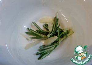 В отдельной посуде смешиваем веточки розмарина, нарезанный пластинками чеснок, соль по вкусу.