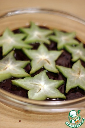 • Разрежьте карамболу на кусочки, уберите семена, уложите ее по кругу на карамель. Мне хватило одной карамболы. Вам может понадобиться и две, все зависит от диаметра вашей формы для выпечки. Учтите это, когда будете готовить.