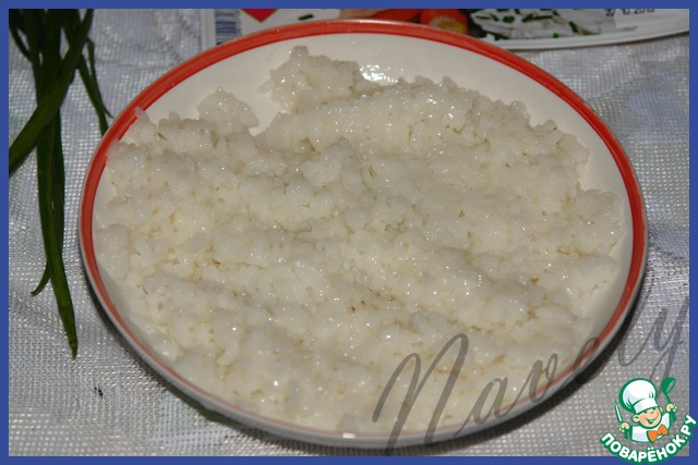 • На лист нори выкладываем равномерно рис, смачивая руки в подкисленной воде, отступив от края 1 см., при этом делая из риса нахлест в один сантиметр шире листа нори, на фото я попыталась это показать.