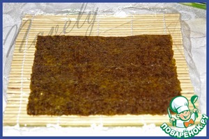 Бамбуковую циновку оборачиваем пищевой пленкой, кладем на ней лист нори, гладкой стороной вниз, я использую не весь лист, нужно отрезать от него полоску шириной 6 см, она лишняя, или даже можно взять половину листа.
