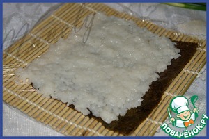 На лист нори выкладываем равномерно рис, смачивая руки в подкисленной воде, отступив от края 1 см., при этом делая из риса нахлест в один сантиметр шире листа нори, на фото я попыталась это показать.