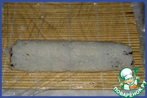 • Преворачиваем нашу заготовку рисом вниз. С одного края кладем немного творожного сыра.