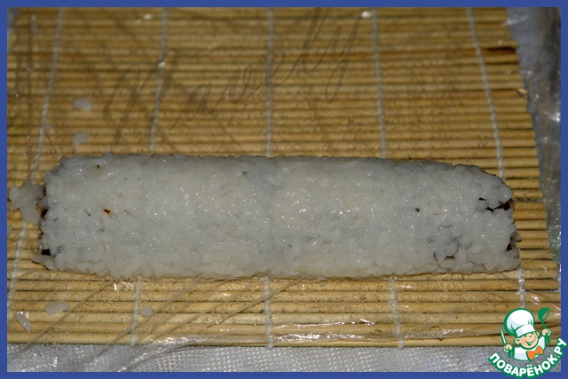 • Бамбуковую циновку оборачиваем пищевой пленкой, кладем на ней лист нори, гладкой стороной вниз, я использую не весь лист, нужно отрезать от него полоску шириной 6 см, она лишняя, или даже можно взять половину листа.