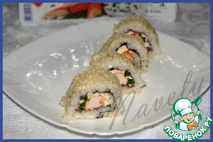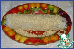 Обваливаем его как следует в кунжуте. Кунжут можно предварительно слегка подсушить на пустой сковороде или в микроволновке. Оставляем ролл полежать минут 15, сразу не режем.