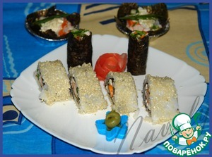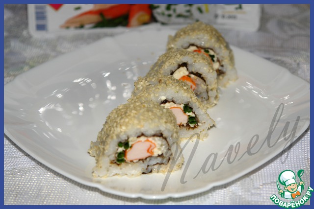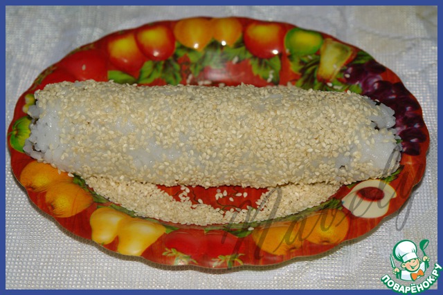 • Обваливаем его как следует в кунжуте. Кунжут можно предварительно слегка подсушить на пустой сковороде или в микроволновке. Оставляем ролл полежать минут 15, сразу не режем.