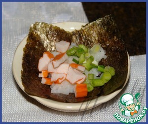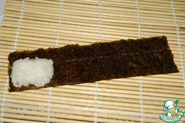 • Или еще вариант, наподобие Гункан-маки. На полоску листа нори выкладываем рис и оборачиваем как бы нори вокруг риса.