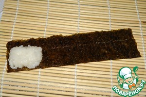 Или еще вариант, наподобие Гункан-маки. На полоску листа нори выкладываем рис и оборачиваем как бы нори вокруг риса.