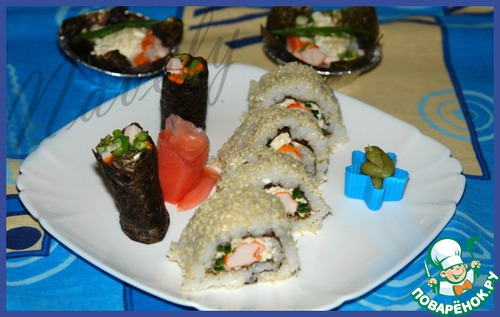 Вдохновившись недавним удачным опытом в приготовлении суши и роллов, я решила экспериментировать с начинками, и вот один из наиболее удачных вариантов - с крабовыми палочками. Очень вкусно!