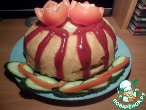Переворачиваем из формы и украшаем кетчупом и овощами.