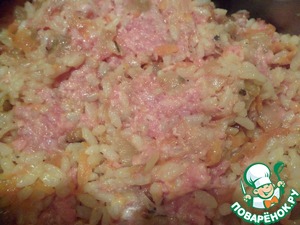 Пожарить нарезанные 1 луковицу и 1 морковь и положить в рис, добавить фарш. Все перемешать с солью по вкусу, добавить перец, базилик.