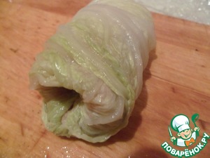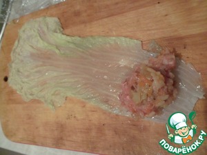 Завернуть 9 листьев китайской капусты в пищевую пленку и, поставив на максимальную температуру в микроволновку на 5 минут, запекать. Вынуть и остудить в пленке.