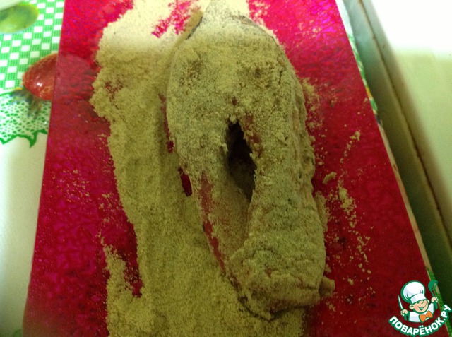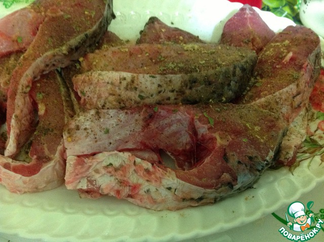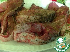 • Рыбу режем на стейки и каждый кусок обмазываем специями