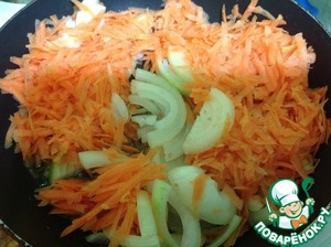 Лук режем полукольцами, морковь натираем на терке и ставим тушиться на среднем огне с 1 ст. л. оливкового масла, по мере надобности подлить водички и тушить минут 10